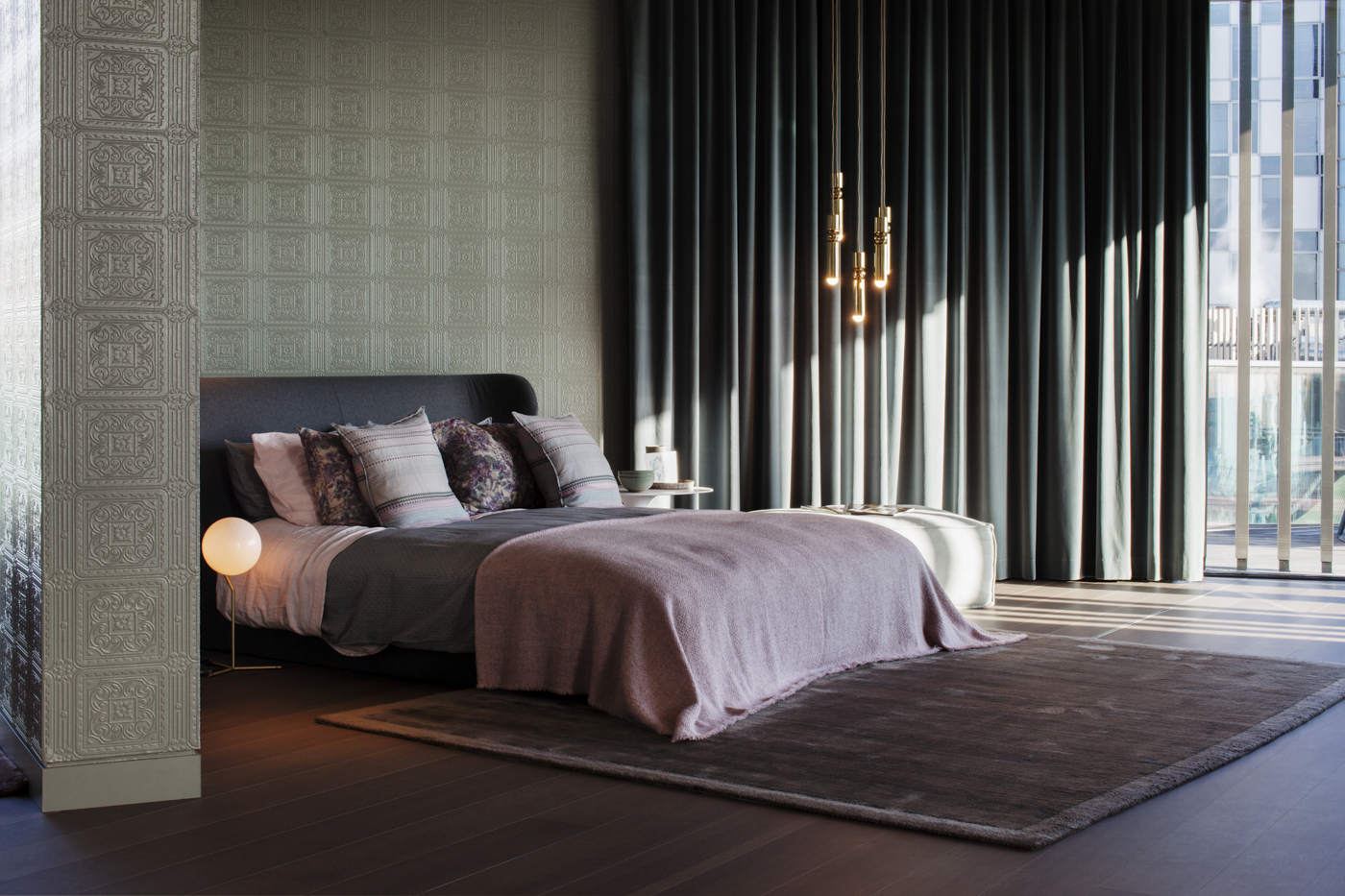 ‘Turner Tile’ may be our boldest paper and adds breath-taking texture to walls. The oversize tiled pattern is complex yet structural and looks equally at home on ceilings as well as walls.
